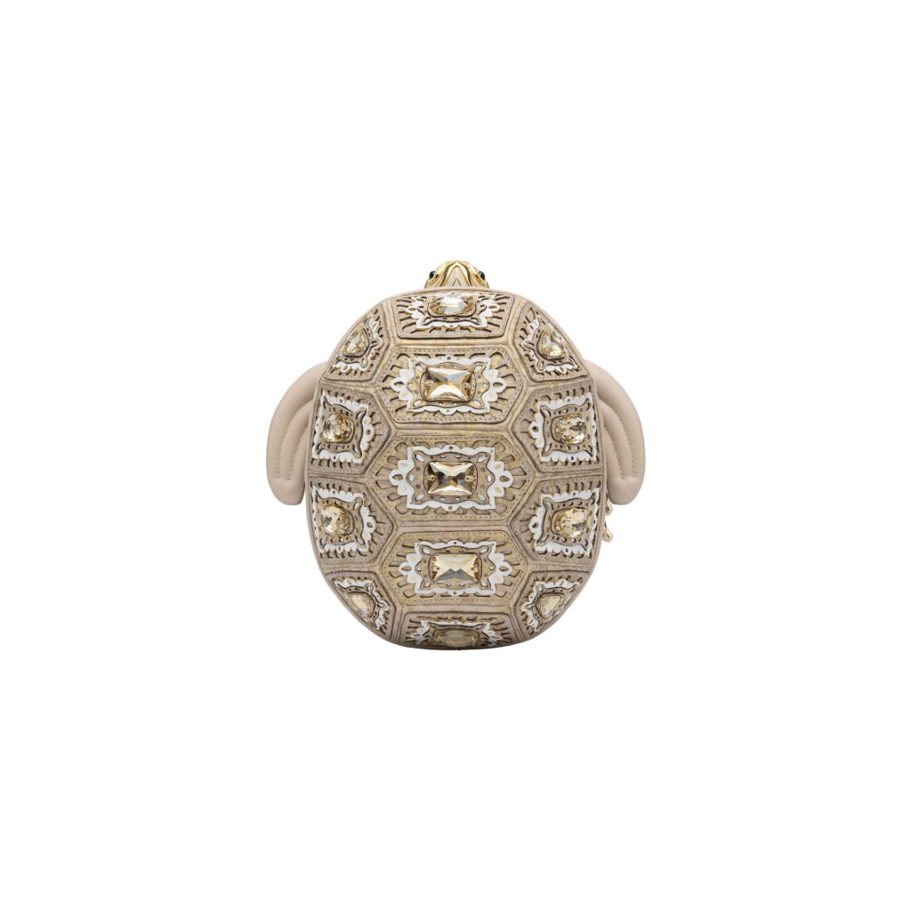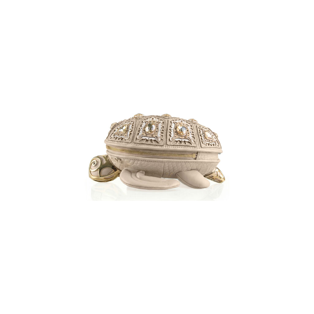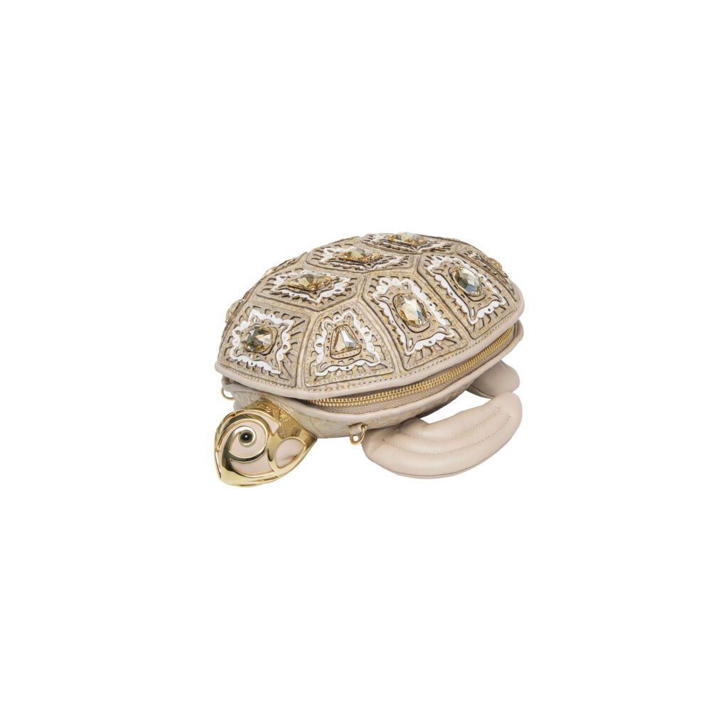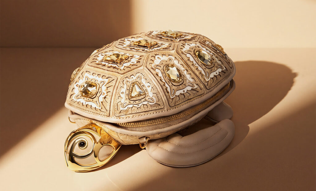 Već na prvi pogled jasno je zašto privlači pažnju. Silueta morske kornjače djeluje razigrano, ali izvedba je sve samo ne dječja. Površina torbe oblikovana je tako da podsjeća na trodimenzionalni oklop, a laserska obrada kože dodatno naglašava reljefnost i dubinu. Ručno aplicirano kamenje na svakom segmentu daje joj gotovo nakitni karakter, pa cijeli model djeluje kao da je nastao negdje između modne fantazije i talijanske radionice koja i dalje vjeruje u spor, precizan rad.