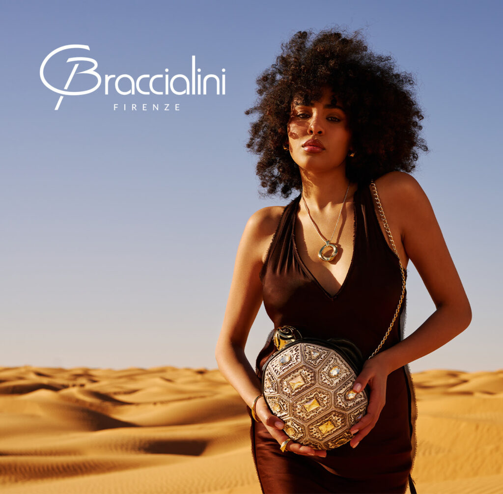 Posebno je zanimljiv spoj bež nijansi, zlatnih detalja i svjetlucavih aplikacija koje podsjećaju na odsjaj sunca na morskoj površini. U tom smislu ova Braccialini torba nosi vrlo jasnu ljetnu emociju, ali bez banalnog oslanjanja na sezonu. Djeluje kao predmet koji ima priču i karakter.