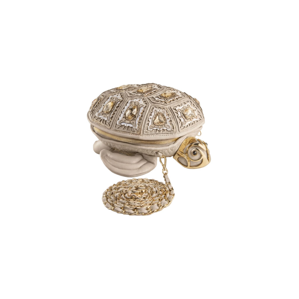 Iako je riječ o izrazito dekorativnom modelu, Tema Tartaruga nije ostala samo na dojmu. Zip zatvarač prati gotovo cijeli opseg torbe, što otvaranje čini praktičnim i preglednim. Unutrašnjost uključuje i džep za mobitel, a zlatni lanac omogućuje nošenje preko ramena ili crossbody način, što je posebno važno kod modela koji se lako pretvaraju u statement komad za dnevne i večernje kombinacije.