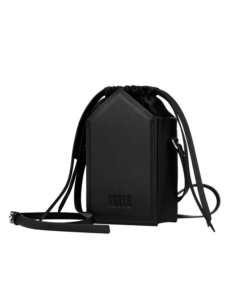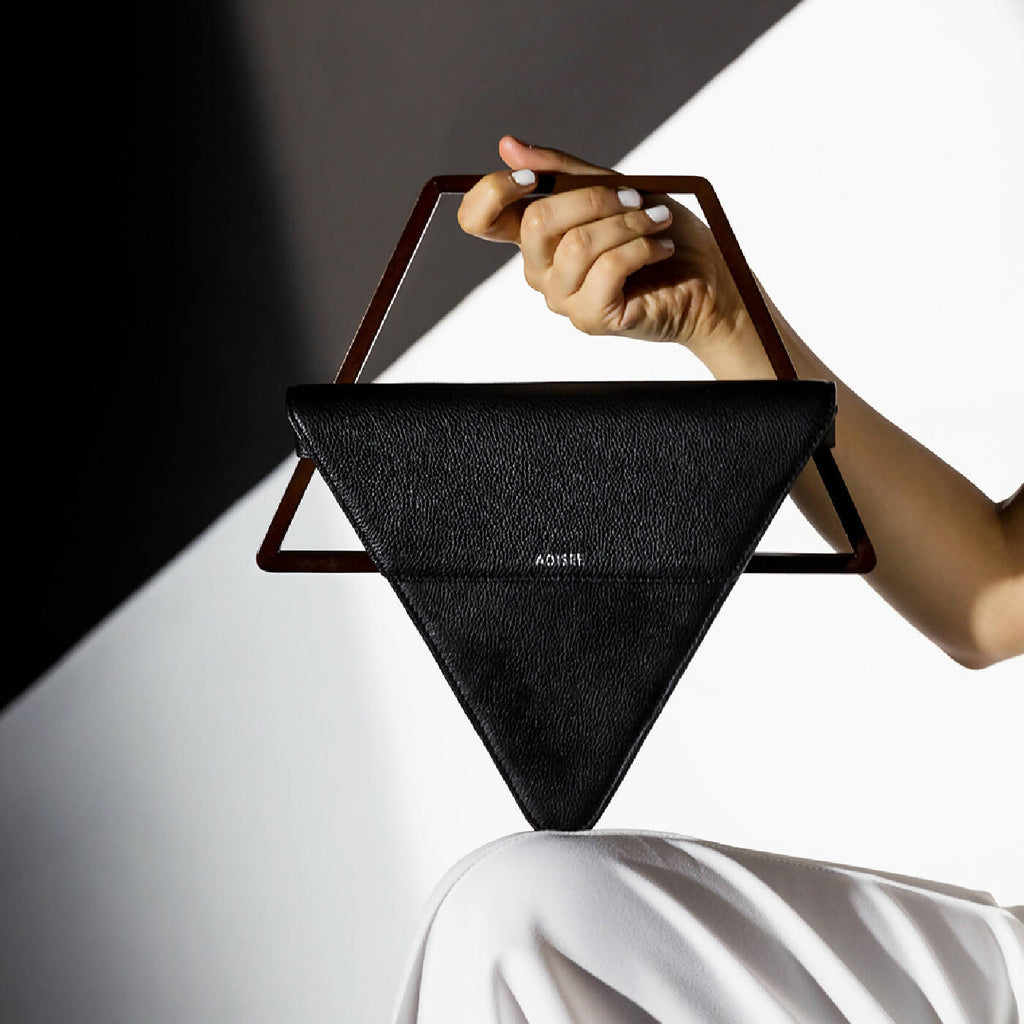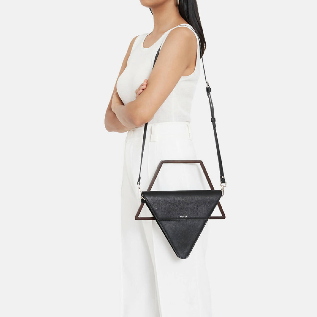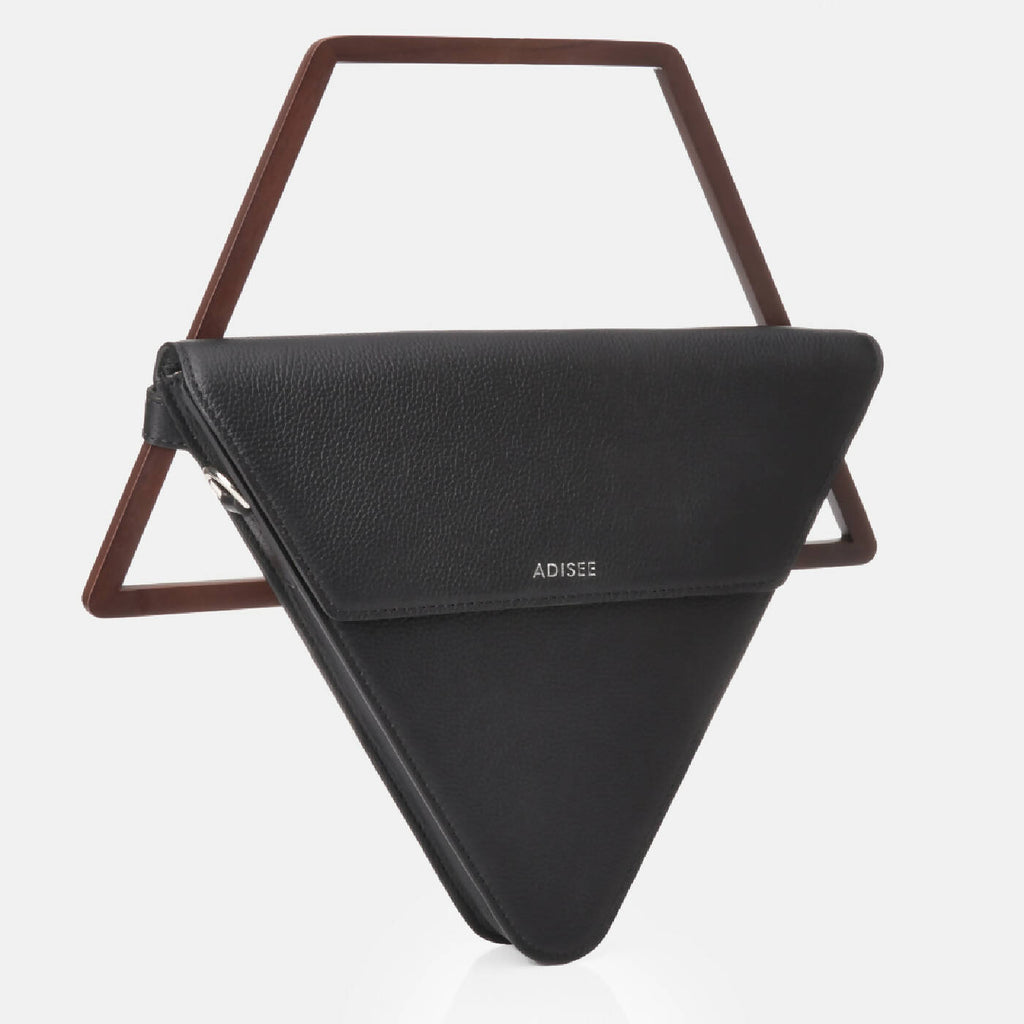 Jade Handbag crna totba od brenda Adisee iz Indije. Jedinstven u svom dizajnu, stvara prekrasnu geometrijsku ravnotežu svojim trokutastim oblikom i uklonjivom drvenom ručkom. Daje vam svestranost držanja za njegovu karakterističnu drvenu ručku ili nošenja kao crossbody s odvojivim kožnim remenom.
