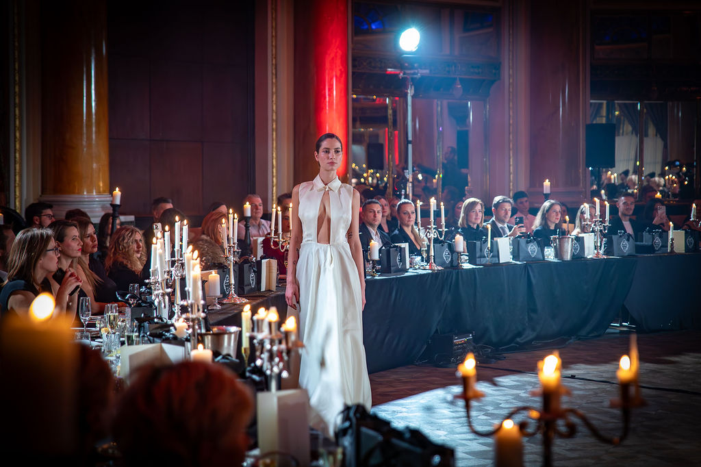 Večer je započela snažnom scenografijom koja je prostor pretvorila u intimni, gotovo filmski ambijent. Uzvanici su bili smješteni oko dva monumentalna, savršeno simetrična kruga raskošno stiliziranih stolova, okruženi morem mirisnih svijeća čije je toplo zlatno svjetlo definiralo atmosferu večeri. Niski baršunasti dim klizio je dvoranom, brišući granice između stvarnosti i inscenacije, dok je cijeli prostor pulsirao tihom, ali moćnom energijom.