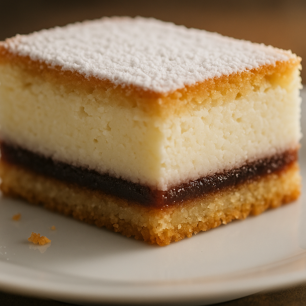 Prozračna krema, tanki sloj tamnoljubičastog džema od šljiva i mekani biskvit.