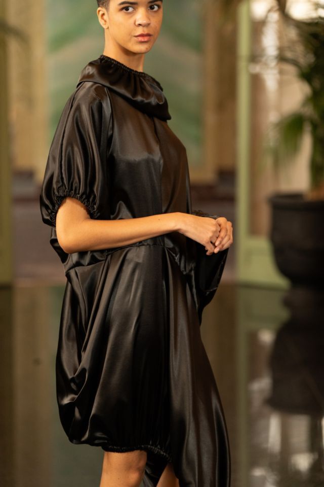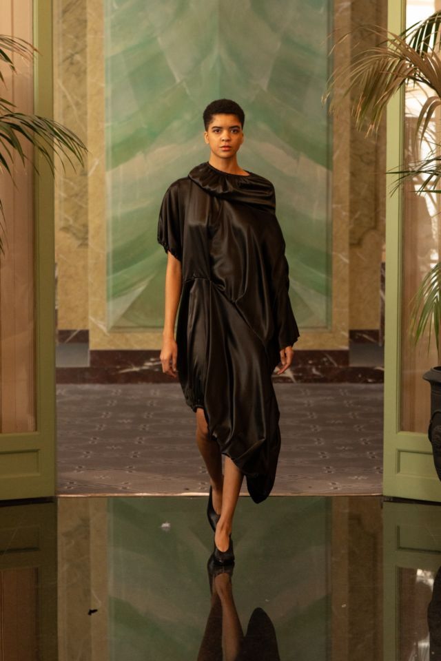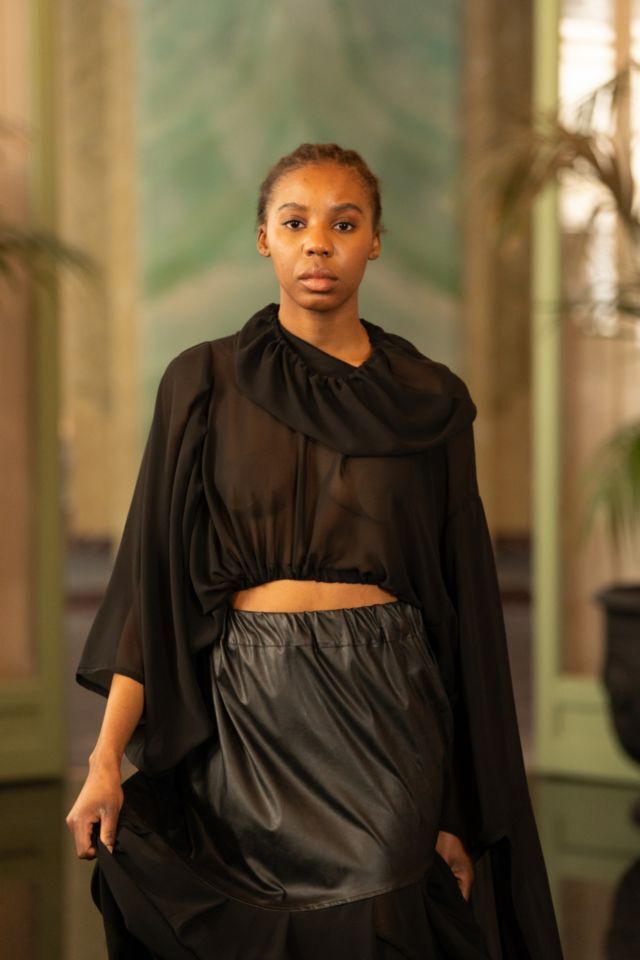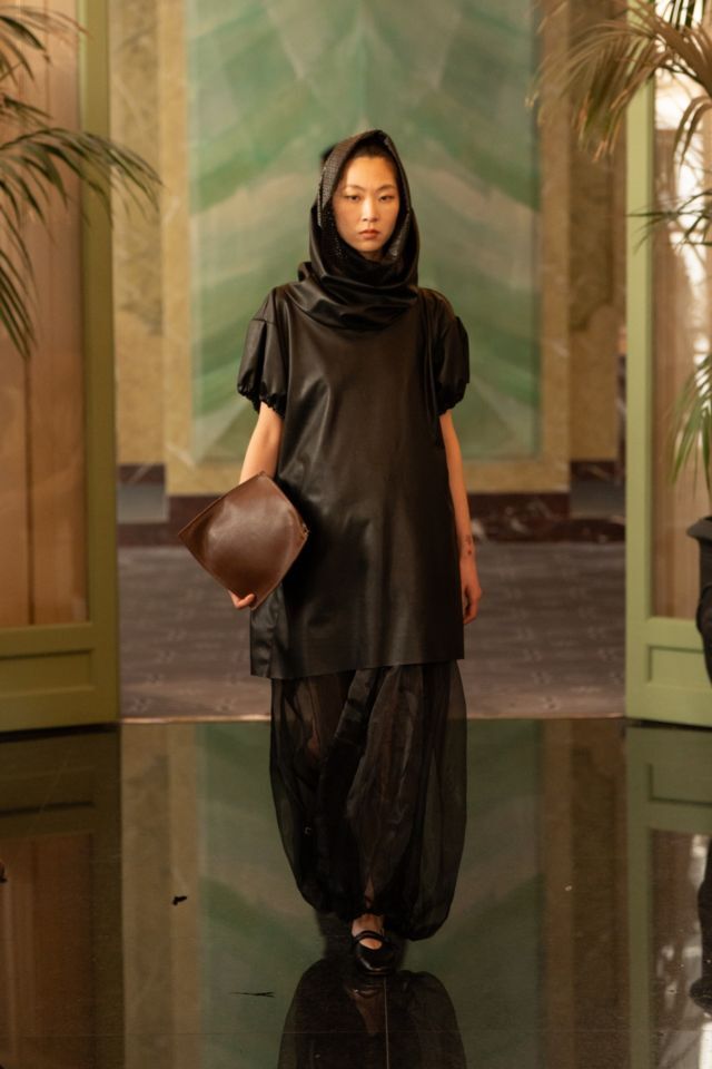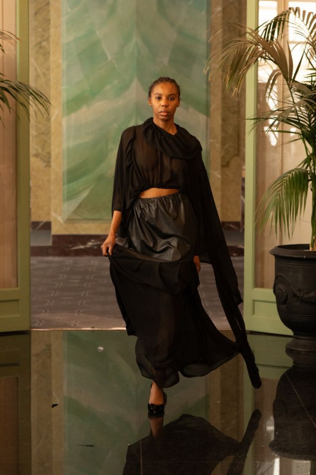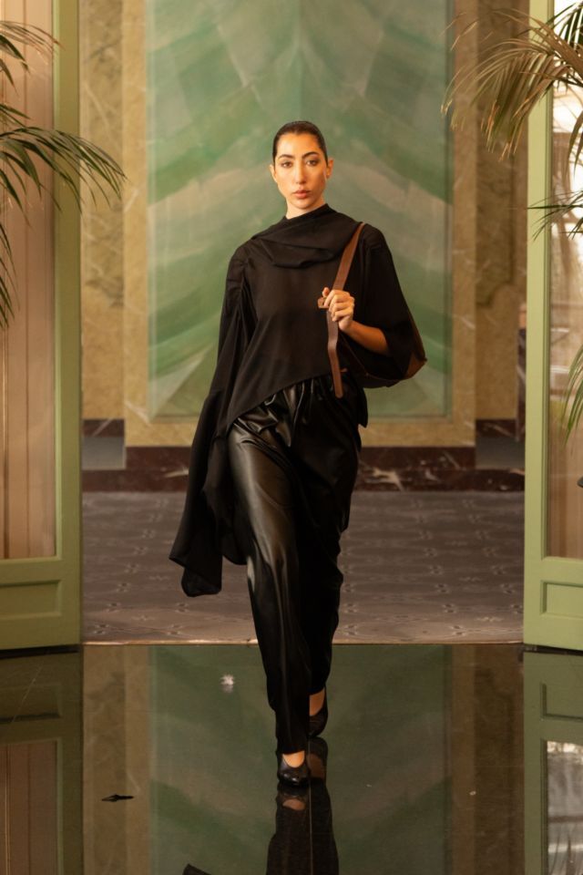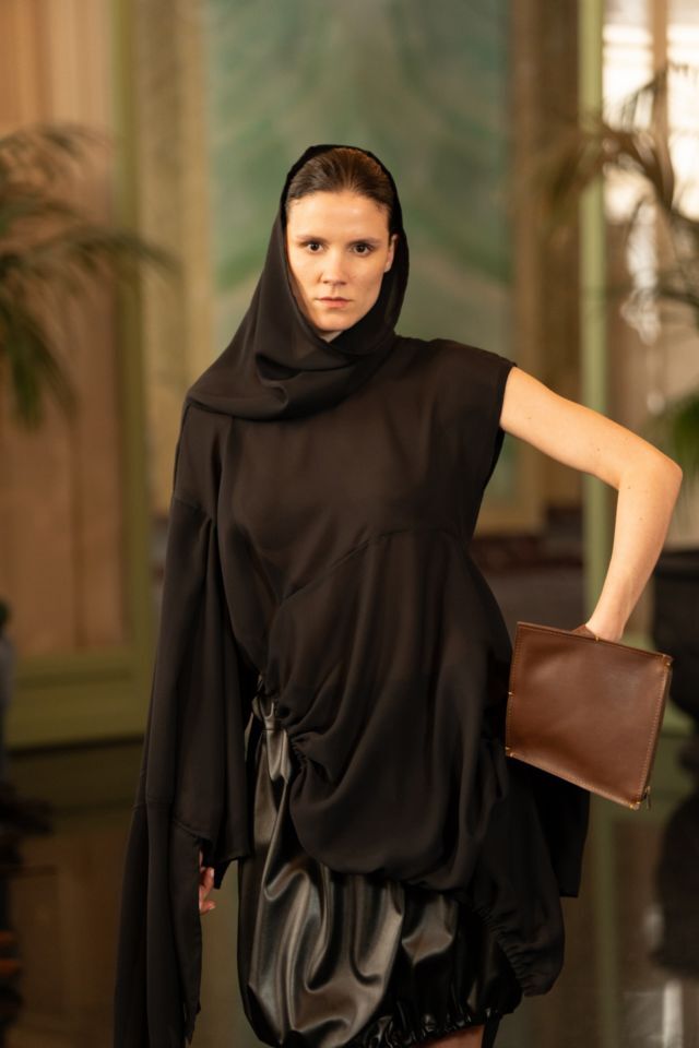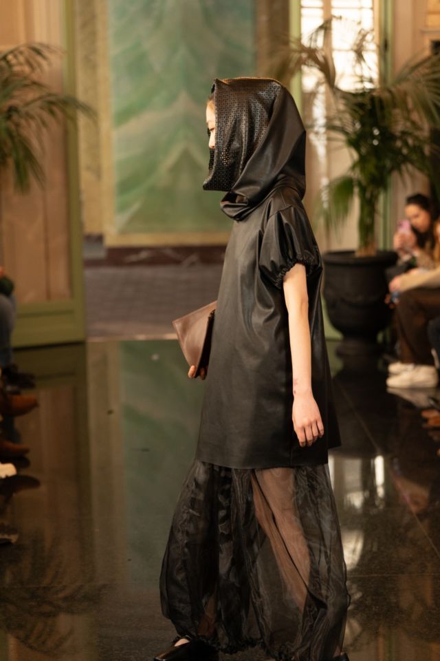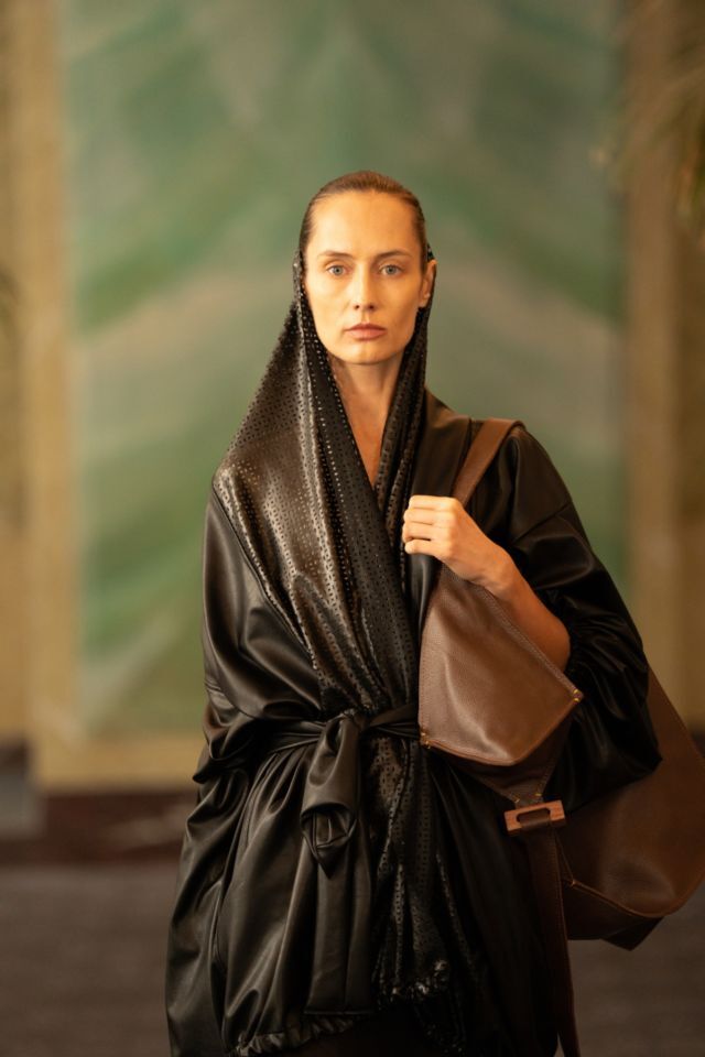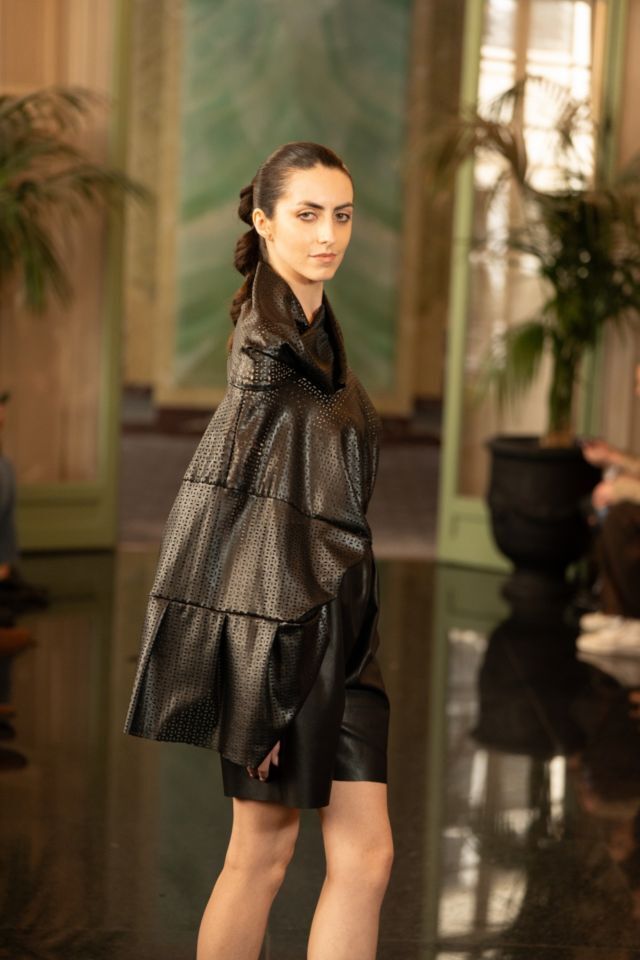 U središtu kolekcije nalazi se crna paleta, koja dodatno naglašava formu, volumen i pokret. Upravo kroz tu svedenu, ali efektnu kolorističku bazu, u prvi plan dolaze krojevi i teksture. Kombinacija umjetne kože i muslina stvara zanimljiv kontrast između čvrstoće i mekoće, dok igra svjetla i sjene kolekciji daje dodatnu dubinu. Prozirni komadi dugih rukava suprotstavljeni su strukturiranim komadima od umjetne kože, čime se postiže osjećaj lakoće, ali i precizne kontrole forme.