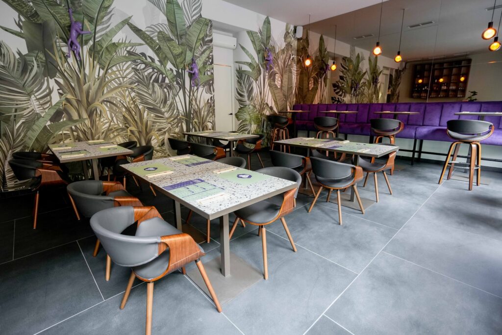 Do sada su postojeće tri lokacije Purple Monkeyja funkcionirale kao dark kitchen, no otvaranjem novog restorana u Tomašićevoj 6, sada se u potpunosti može uživati u šarenom svijetu Purple Monkeyja. Interijer restorana podsjeća na prašumu s ilustracijama biljaka na zidovima i bambusima koji vise sa stropa. Radno vrijeme restorana prkosi zagrebačkoj tradiciji, pa će petkom i subotom vrata biti otvorena do 1 ujutro, a jela se mogu naručiti do 23 sata. Od ponedjeljka do četvrtka, restoran će raditi do 23 sata, a dostava je također moguća.