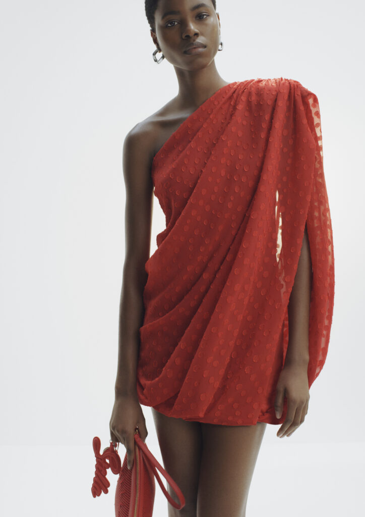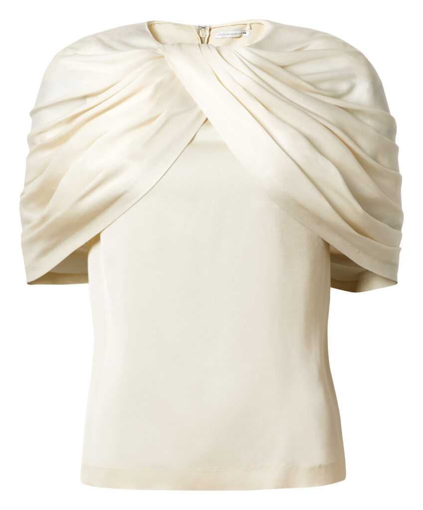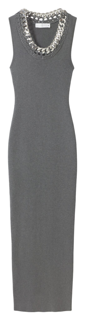 Među komadima koji se najviše izdvajaju nalaze se rebraste pletene haljine i topovi s prepoznatljivim Falabella lancem oko vrata, detaljem koji se već dugo veže uz ime Stelle McCartney. Posebnu pažnju privlači i duga bijela haljina s rukavom nalik pelerini koji se nastavlja u rub, pa pri kretanju stvara gotovo kružnu liniju. To je onaj tip komada koji odmah nosi sliku, pokret i određeni modni stav.