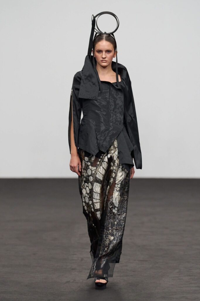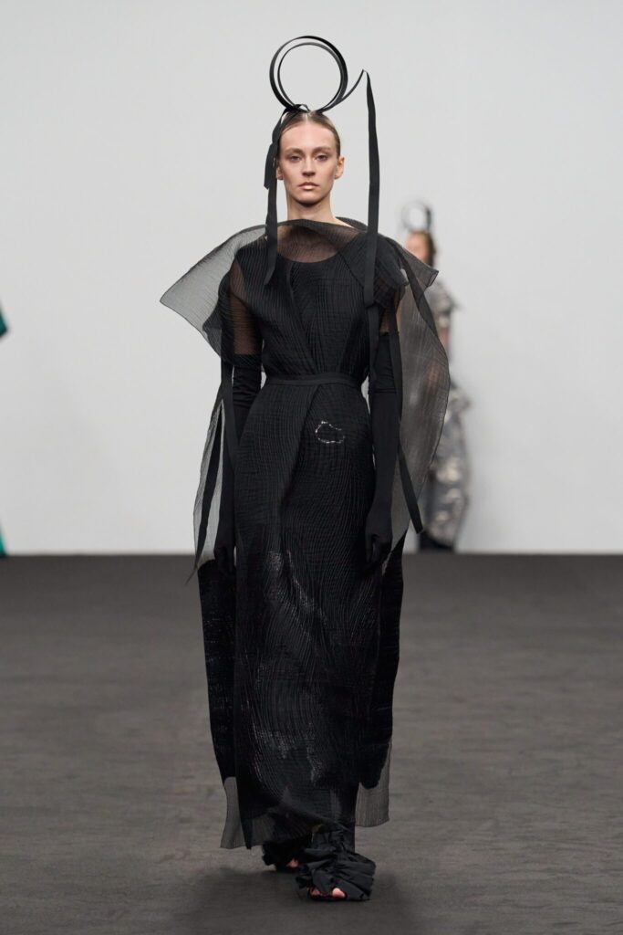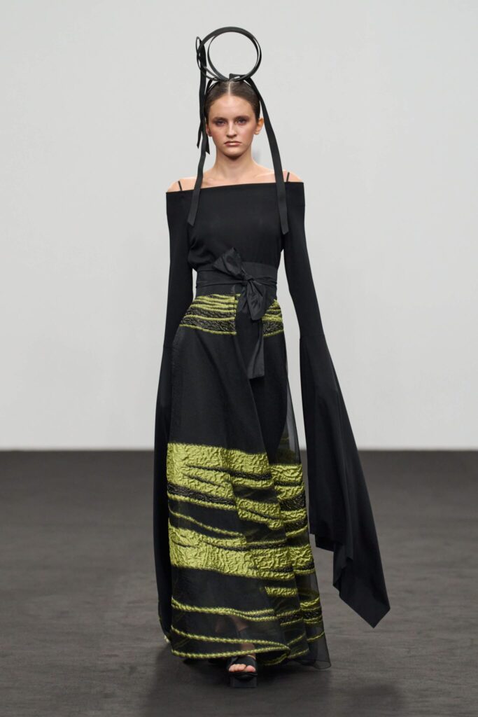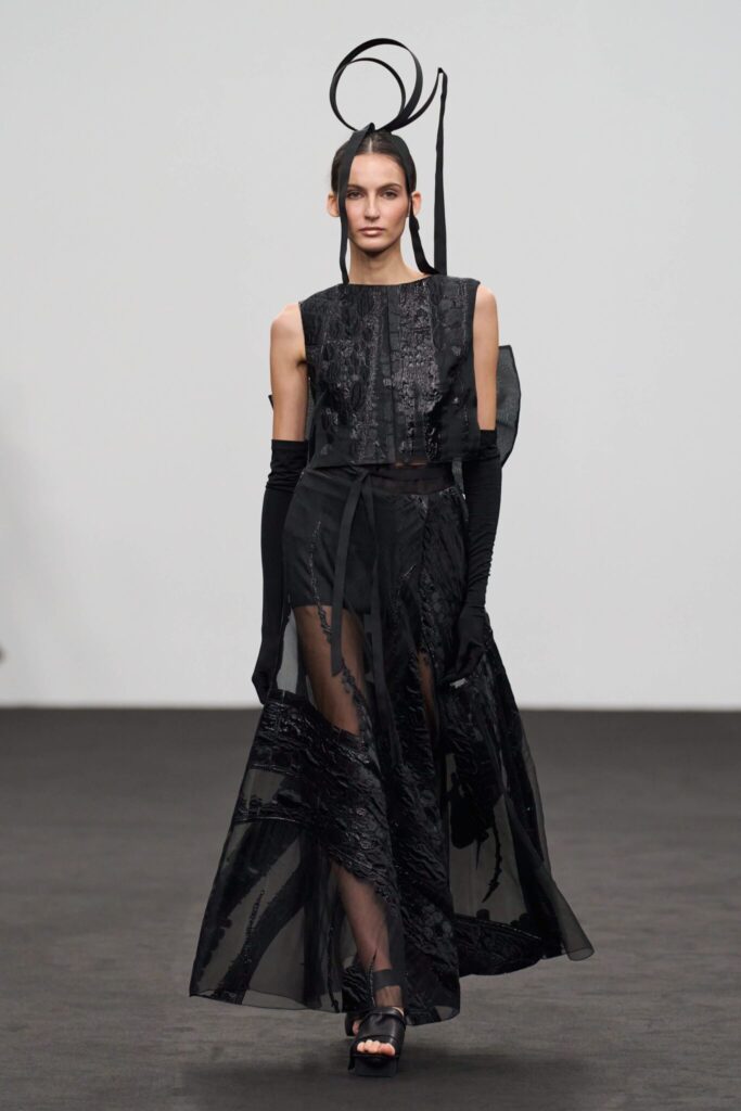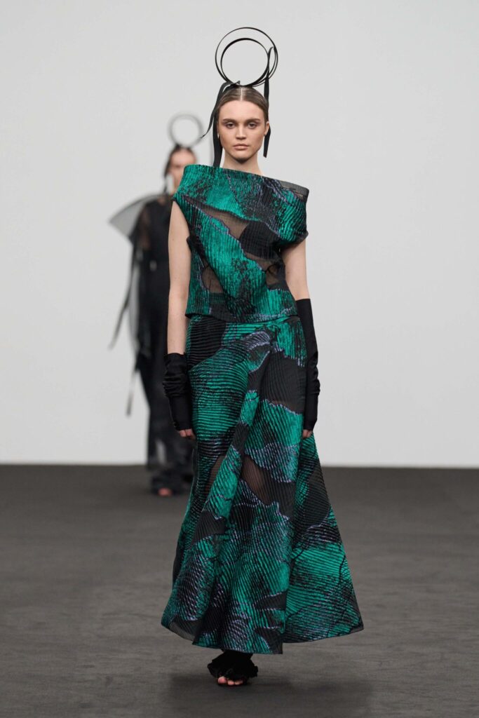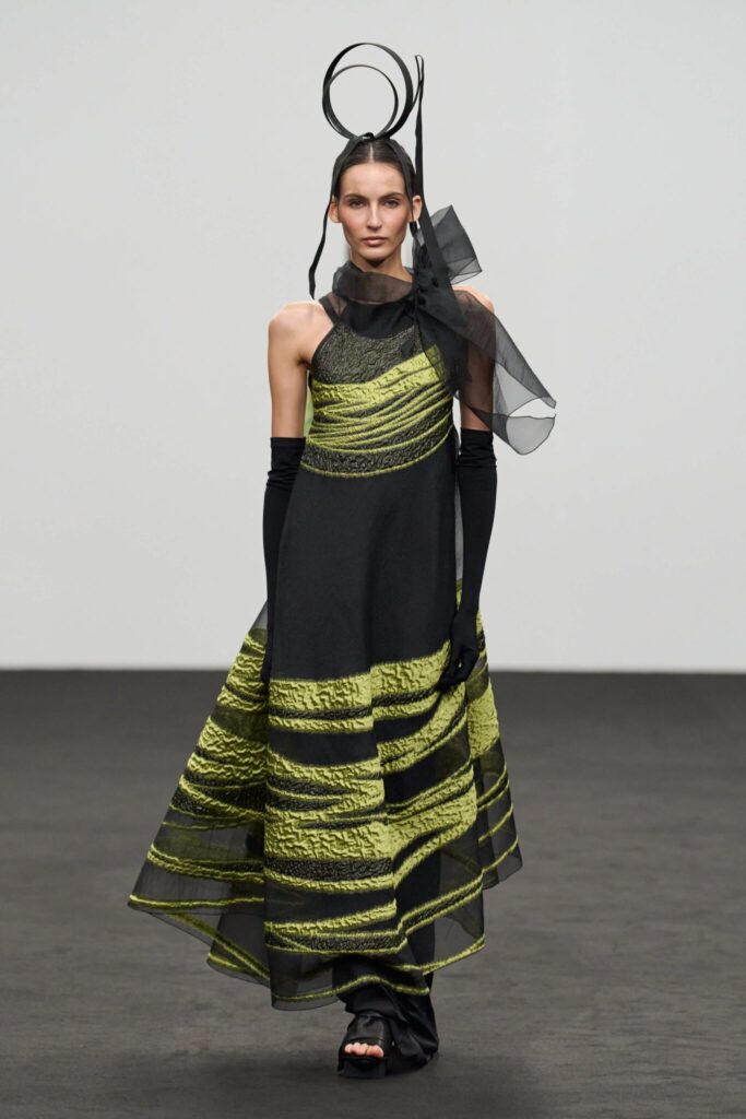Kolekcija donosi potpuno unikatne materijale i konstrukcije, izrađene isključivo za ovu liniju. Nježni kontrasti luksuznih tkanina i naglašene siluete podsjećaju na skulpturalne forme, dok su detalji izvedeni s iznimnom preciznošću krojačkog umijeća. Publika je mogla vidjeti spoj discipline i spontanosti – couture koji ne pokušava sakriti proces nastanka, već ga slavi kroz vidljive „zlatne linije“ kroja i detalja.