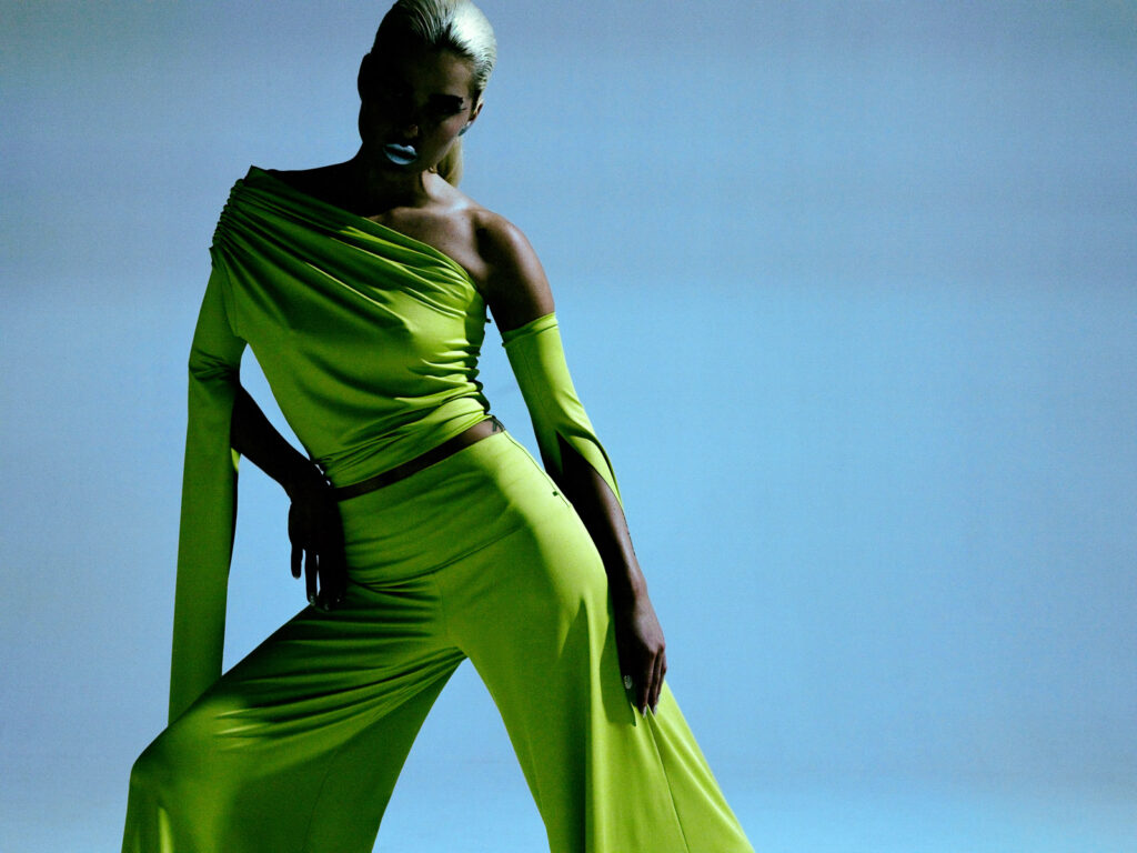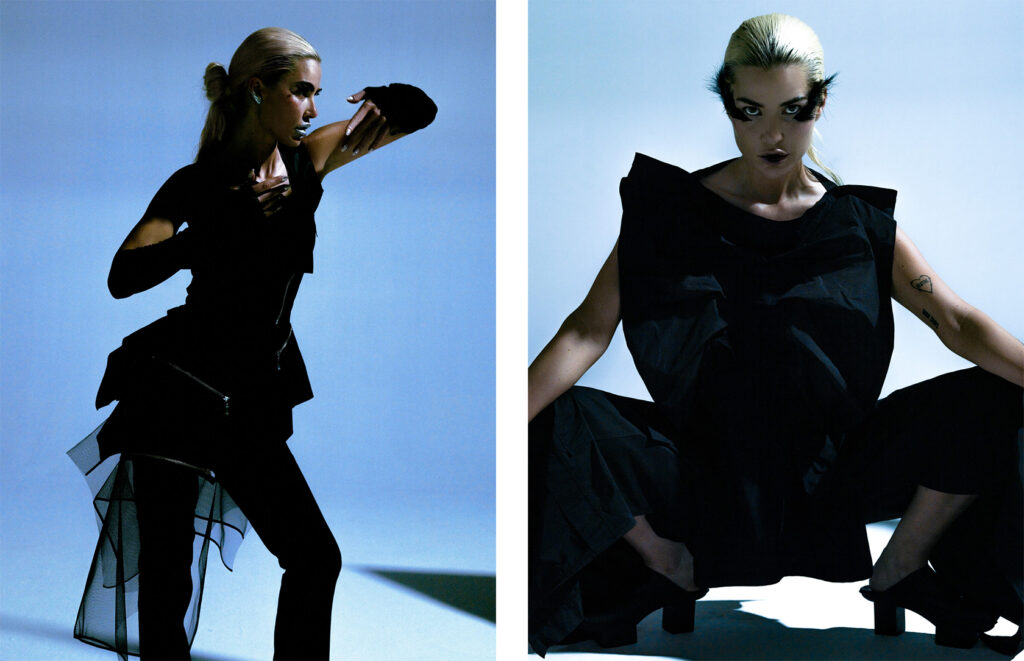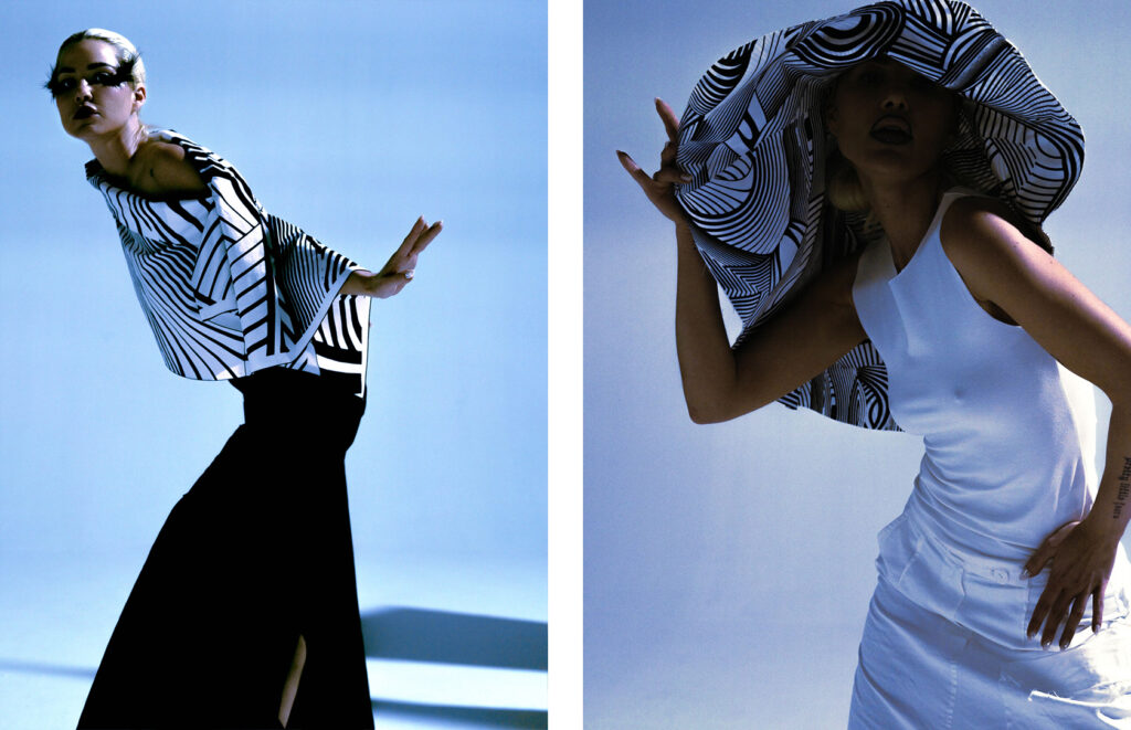 Prepoznatljive XD siluete drapiranih haljina oživljavaju kroz jedinstvene apstraktne, op art i pastozno crne printove. Vibrantne plave, limeta i ružičaste boje plešu u ritmu s bezvremenskom crno-bijelom paletom, dok geometrijske linije u printovima prelaze od tankih do apstraktnih i gesturalnih poteza. Teksture oživljavaju kroz igru mrežastih i prozirnih tkanina u kontrastu s mat i neprozirnim pamučnim komadima.